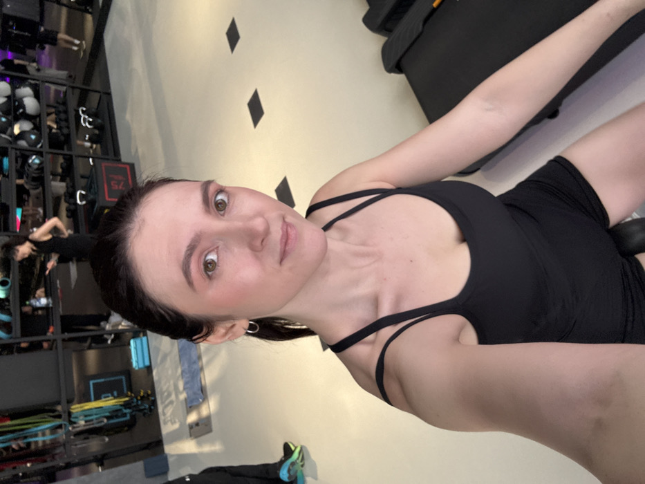 An indoor gymnasium is depicted. The primary subject is a female, appearing to be in her late 20s to early 30s, with fair skin, brown eyes, and dark brown hair pulled back. She is wearing a black athletic top with double straps and black athletic shorts. She exhibits minimal makeup, including pink blush/eyeshadow, and wears small silver hoop earrings. She is engaged in a selfie-style photograph, holding the camera with her extended right arm, and looks directly forward with a neutral to slight smile. She is seated on black exercise equipment, possibly a spin bike or similar apparatus. The environment features a light-colored floor with dark square markings. In the background, black shelving units against a dark wall contain various fitness equipment, including dumbbells, kettlebells, medicine balls, and resistance bands. A blue exercise mat is visible on the floor to the left. Two other individuals are present: one female in dark athletic wear is standing near the shelves, appearing to interact with a handheld device; a male's lower leg and foot, wearing black pants and green/blue athletic shoes, are visible on the far left. Another figure is partially discernible through reflection further back. A black plyometric box with a red "75" marking is on the floor. This scene is located within a gym in the city of Kazan, Russia.