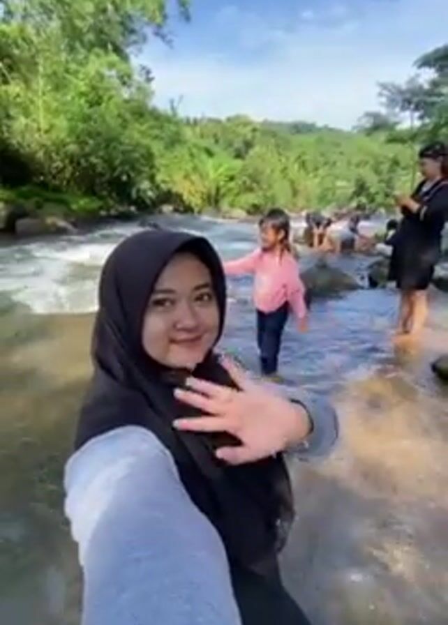 A woman wearing a black hijab holds a camera and films in a river. A young girl in a pink sweater and jeans walks through the water in the background. Other people, including another woman and a man, are standing and walking in the river and on the rocks. There is a red tent on the shore in the background. Lush green trees surround the river. The sky is blue with scattered clouds. The water is moving rapidly over rocks in the river.