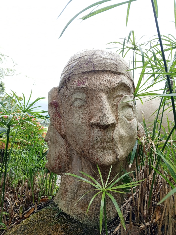 A weathered, multi-faced stone sculpture of a human head is depicted outdoors in Yarsonnah, Liberia