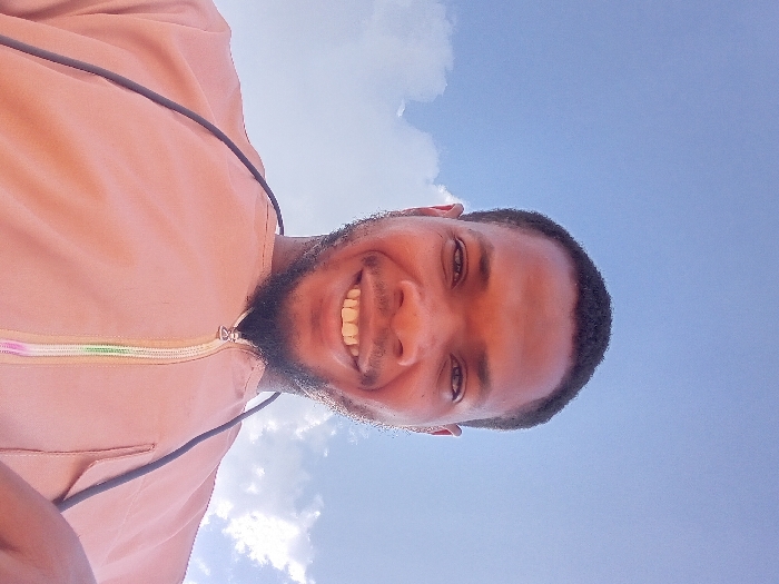 A man smiles broadly towards the camera against a bright blue sky with scattered clouds. He has a dark beard and short hair. He wears a light brown jacket with a visible zipper and a black cable running across his chest. The photo appears to be taken from a low angle.