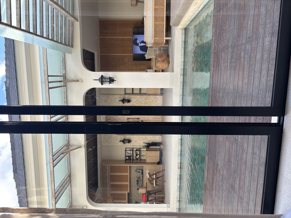 - "The image displays an indoor-outdoor living area of a property located in Kerobokan, Indonesia, viewed through partially closed dark-framed sliding glass doors" by FM-kVMXo2, licensed under CC BY 4.0
