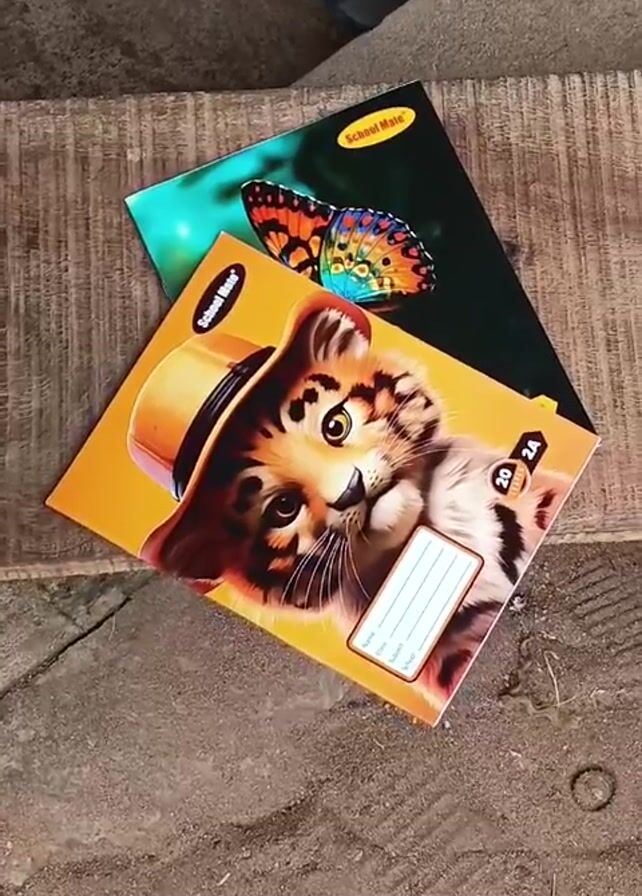 Two notebooks are on a wooden surface. The top notebook is orange with a picture of a cat wearing a hat. The bottom notebook is green with a butterfly on it. Both are labeled “School Mate”. The background is a cement floor and part of a blue chair.