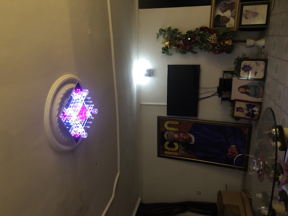 A living room features a white ceiling with an ornate, square chandelier. A large framed portrait of a man with the word "ICON" beside him leans against the wall below a black television. Above the TV, decorative greenery with a gold star hangs. Several smaller framed photos are stacked to the right of the TV. A glass-topped table with items on it sits near a beige couch and dark curtains. The wall is painted a light grey color.