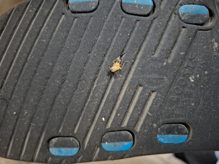 The image displays a close-up, downward-angled view of a black rubber sandal or flip-flop sole, located within the city of Rukn ad-Din Municipality, Syria. The sole features a pronounced ribbed tread pattern with parallel raised lines traversing diagonally across the frame from upper left to lower right. Several oval-shaped inserts, each partially blue and partially dark, are embedded into the sole's surface. Partially legible embossed text, "LACOSTE," is visible on the lower central portion of the sole. A small, crushed insect, primarily yellowish-brown with dark fragments and splayed appendages, is affixed to one of the diagonal ribs, slightly above the image center. The insect appears flattened and dismembered. The sole's surface shows signs of minor wear and is covered with scattered dust particles and small light-colored debris. The background is indistinct and out of focus.