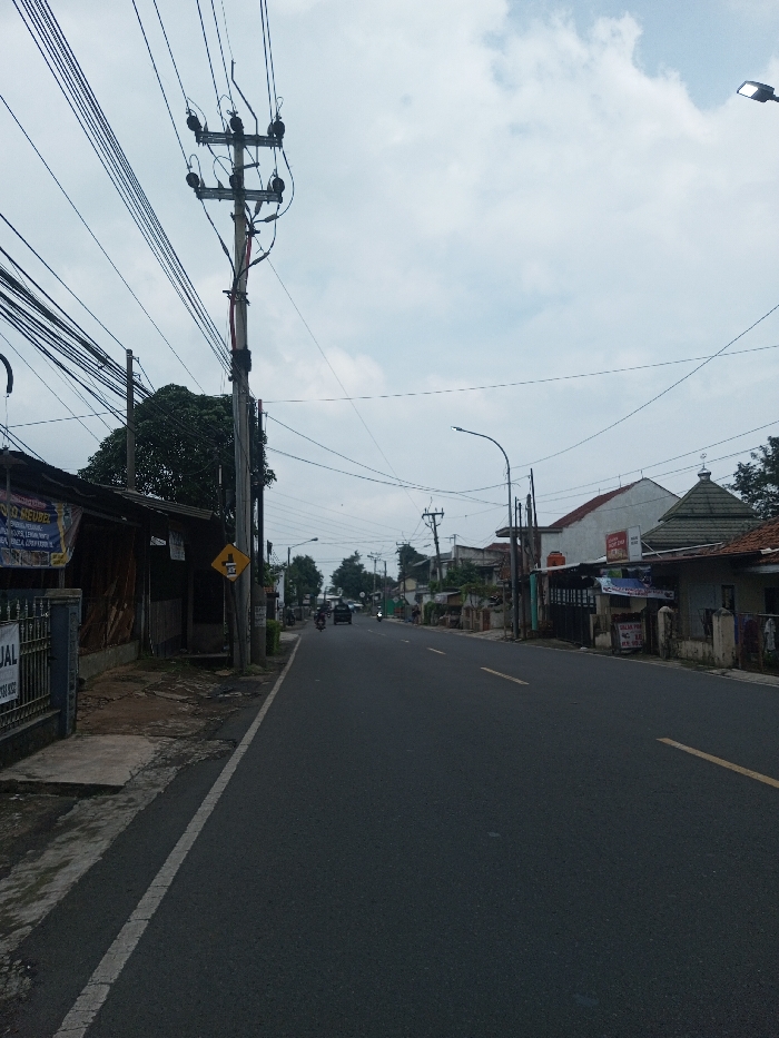 The image depicts a street scene, identified by the prompt as being in the city of Sandamal Eliya, Sri Lanka. A two-lane asphalt road, marked with a yellow dashed centerline and white solid edge lines, extends into the distance under an overcast sky. On the left side of the road, a concrete sidewalk runs parallel, bordered by a low metal fence. Behind this fence, a single-story commercial building with a dark-colored roof is visible. A large banner affixed to this building displays partially legible Indonesian text, including "FOTO HEUREL" and "DIGITAL CETAK." A prominent utility pole, equipped with multiple cross-arms and numerous bundled power and communication lines, stands near the roadside. Attached to this pole is a yellow warning sign depicting a right turn with a steep incline. Further down the street on the left, additional structures and dense foliage are visible. On the right side of the road, a sequence of diverse single-story and two-story buildings, appearing residential and commercial, lines the street. One distinct building features an octagonal-shaped roof capped with a finial bearing a crescent moon and star, indicating a mosque or Islamic prayer space. Visible signage on the right also includes Indonesian text such as "WARUNG" and "JUAL." Modern LED streetlights are spaced along this side. In the mid-distance on the road, three vehicles are observed traveling away from the viewer: two motorcycles and a dark-colored car. No pedestrians are present. The environment appears to be a mixed residential and commercial area with developed infrastructure.