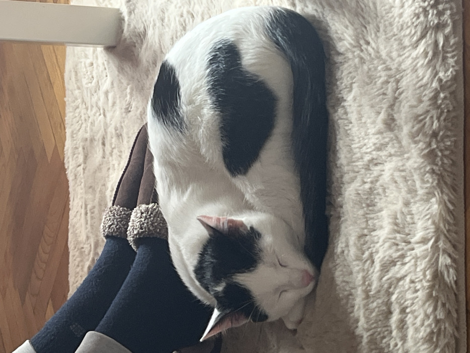 The image depicts an indoor scene in Varna, Bulgaria. A bi-color domestic cat, predominantly white with black patches, is curled up asleep on a light-beige shaggy rug. The cat has black markings on its head and ears, a prominent black heart-shaped or irregular patch on its left flank, and a black tail. Its eyes are closed, and its nose is pink. To the left and slightly behind the sleeping cat, two human feet are visible. The feet are clad in dark blue socks with light grey cuffs and wear brown, fuzzy-lined slippers. The rug rests on light brown hardwood flooring, partially visible in the upper background and edges of the frame. A portion of a white vertical object, possibly a furniture leg, is present on the far right. The scene conveys a tranquil, domestic setting.