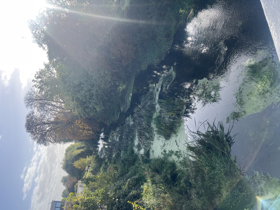 This image depicts a section of the River Colne in Colchester, United Kingdom, likely viewed looking southeast from a bridge on North Station Road. The scene is illuminated by strong, low-angle sunlight from the upper right, creating a distinct lens flare and indicating a sunny day under a partly cloudy sky. The River Colne occupies the central and lower portions of the frame, flowing from the background towards the foreground. Its surface exhibits calm, reflective dark water interspersed with extensive patches of light green algal bloom or duckweed, alongside dense clumps of dark green aquatic reeds and grasses that partially obstruct the water flow. Both river banks are heavily vegetated with a mix of deciduous trees and shrubs. The foliage displays various shades of green, with some trees showing early autumnal browns and yellows. The right bank is densely covered with trees. On the upper left bank, a modern, multi-story building with visible windows is partially obscured by green foliage. A white railing or low wall structure is also visible on the left bank in the middle distance. The foreground shows a white structure, consistent with a bridge railing, from which the photograph was captured. No individuals are present in the scene.