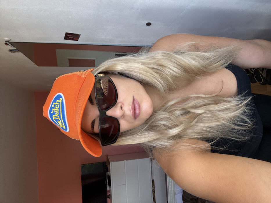 An adult female individual is depicted in an indoor residential setting located in Wattrelos, France. She is shown from approximately mid-chest upward, with blonde, wavy hair. She wears an orange mesh-back trucker hat featuring a blue oval "Von Dutch" logo with a white outline, and dark, rectangular-frame sunglasses with a gold-colored accent visible on the right temple arm. Her lips are closed. She is wearing a dark-colored tank top or sports bra. The background on the left displays a peach-colored wall, a white chest of drawers, and a dark flat-screen television on top of it. A portion of a white bed or headboard is visible at the bottom left. The background on the right consists of a white wall or door frame, with a vertical rectangular mirror reflecting the peach-colored wall and an adjacent space. A small photograph is affixed to the white wall in the upper right quadrant. The individual is oriented towards the camera, suggesting a selfie.