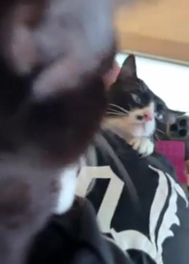 A man wearing a black hoodie with white designs is shown from the shoulders up holding a black and white cat in his arms. A second black and white cat is in the foreground. The man holds a phone in his right hand. The cat on the man’s shoulder looks at the camera and appears relaxed. The cat purrs loudly.