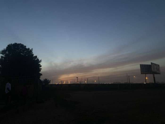 A dusky landscape unfolds under a sky transitioning from deep blue to pale orange. Wispy clouds streak across the horizon. A large tree and a small structure stand silhouetted in the foreground, with indistinct figures nearby. In the midground, a line of evenly spaced lights illuminates a road or area. A billboard stands prominently on the right, completing the scene. The overall tone is muted and subdued, evoking a sense of quiet stillness at twilight.