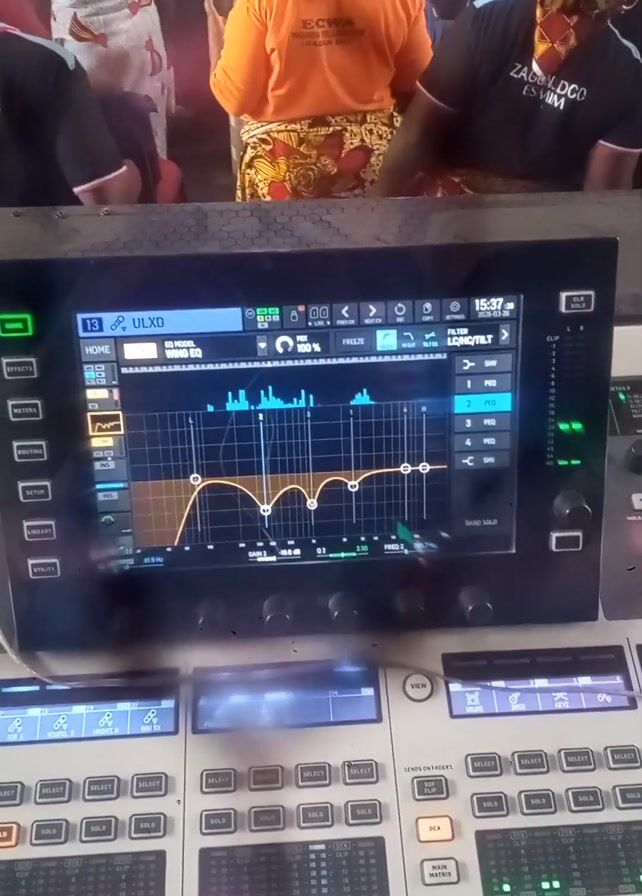 sound mixing console in use, with a screen displaying audio waveforms and equalization settings. Several people are visible in the background, some wearing colorful traditional clothing. The console has numerous buttons, faders, and a large touchscreen display. The display shows a graphic representation of the sound's frequency response, indicating adjustments being made to the audio signal. The room appears to be filled with people, likely a live event setting. The sound console operator is making changes to the sound settings while music plays in the background.
