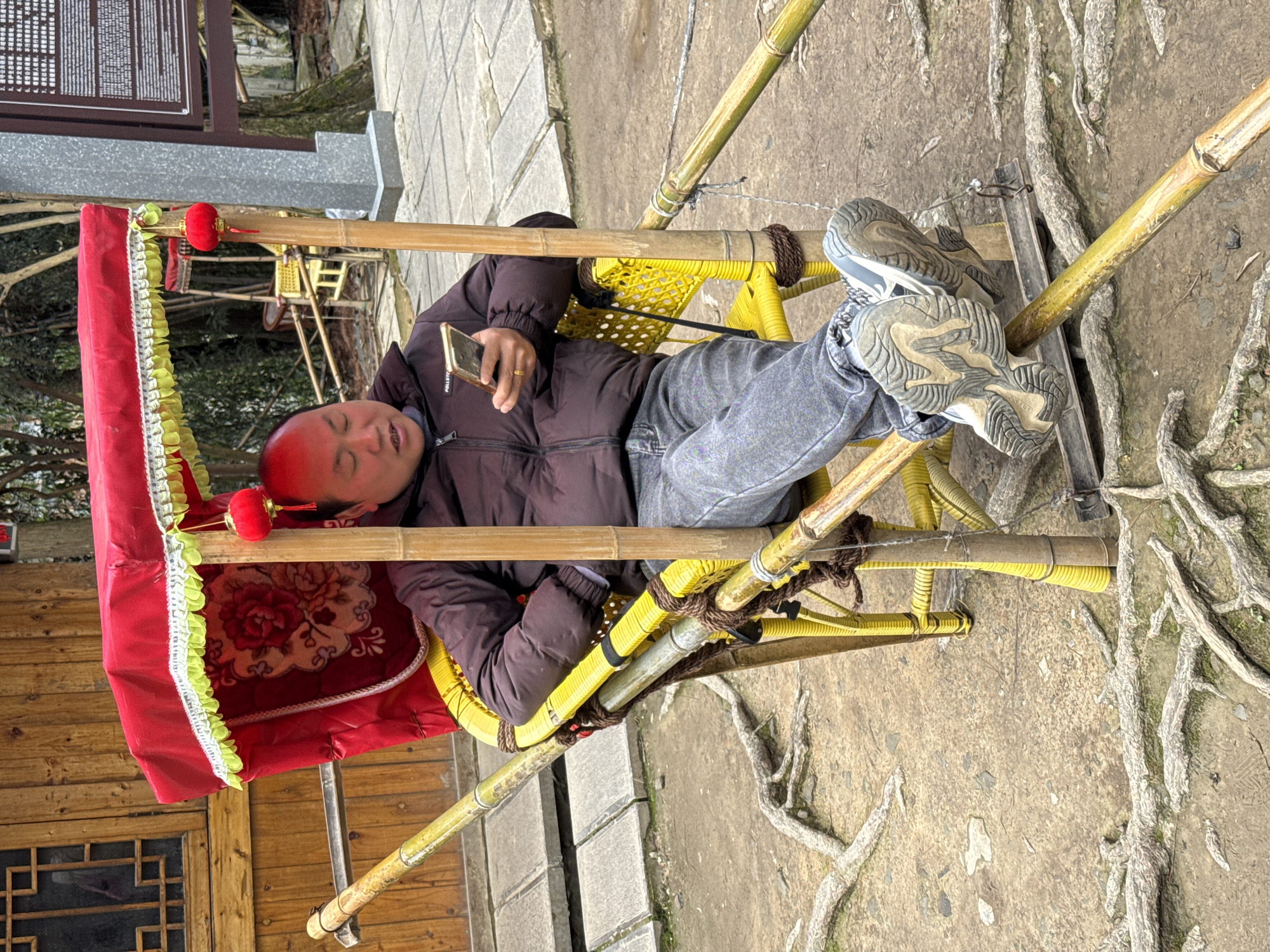 An adult East Asian male is seated in a yellow bamboo sedan chair under a red canopy, holding and observing a gold-colored smartphone with both hands. He wears a dark brown puffer jacket, grey jeans, and grey and white athletic shoes, with his feet resting on a horizontal bamboo support pole of the chair. A gold ring is visible on his left ring finger. The sedan chair features a red fabric canopy with a green and white fringe, and a white interior lining with a red floral pattern. Small red lanterns with tassels hang from the front supports. The chair frame is constructed from yellow bamboo poles, secured with dark brown rope. The scene is outdoors in Luoguta, China, characterized by exposed tree roots on a dirt ground surface. In the background to the left, a wooden building with a lattice window is visible. To the right, a grey stone pillar supports a dark grey rectangular sign displaying white text. Another similar, unoccupied sedan chair is partially visible in the mid-ground to the right. Paved stone sections are visible in various parts of the background.