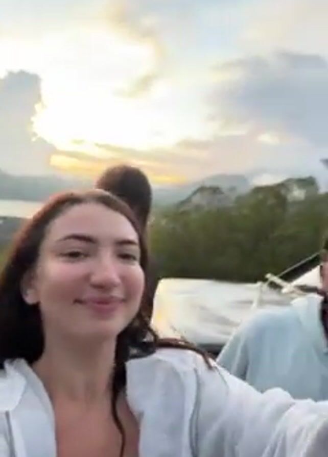 woman taking a selfie of herself and a man, with two other people sitting on the roof of the vehicle they are in. The woman has long, dark hair and is wearing a white zip-up hoodie. The man beside her has short, dark hair and is wearing a light blue hoodie. Both of them make hand signs at the camera. Two other people are sitting on the roof of the black SUV, one facing forward and the other with their back to the camera. The background features trees, a body of water, and a mountain in the distance, set against a cloudy sky with the setting sun. The video seems to have been taken during a casual outing.