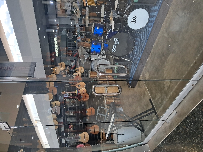 A music store is seen through glass doors. Numerous guitars hang vertically on shelves. Above them, a drum set is displayed with 'Stagg' printed on the bass drum. The doors have silver handles. The reflection on the glass obscures some details of the shop interior. Part of the flooring outside the store is visible.