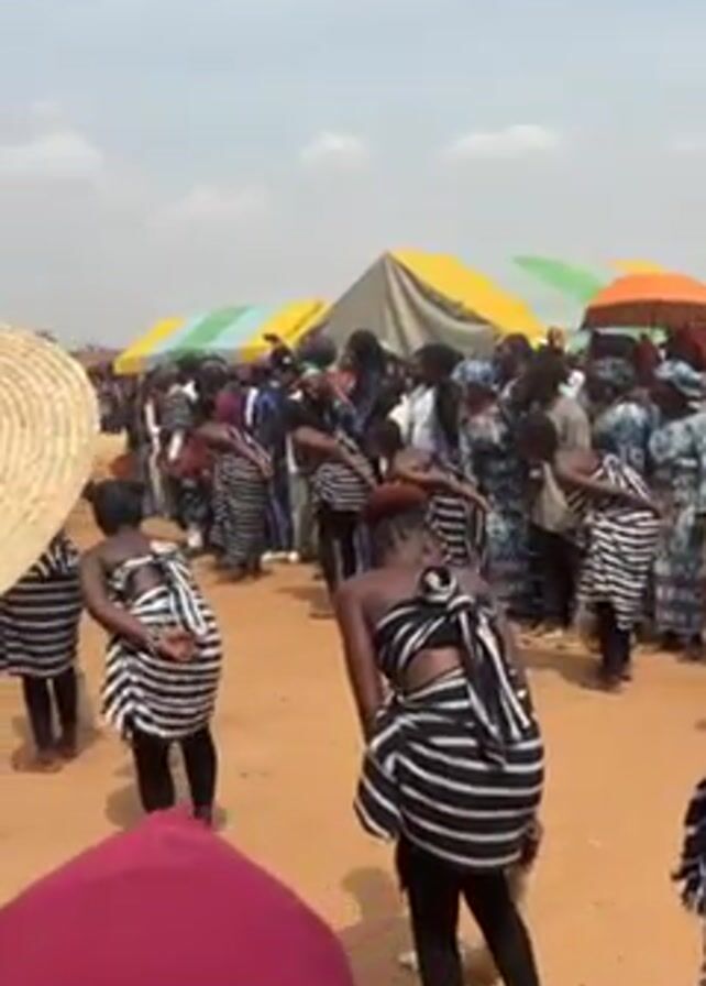 crowd of people gathered in an outdoor setting. There are several women wearing black and white striped cloth tied around their waists and black leggings, bending forward and moving to the beat of music. Behind them, there's a larger group of people, some wearing colorful patterned clothing. In the background, several tents or canopies with yellow, green, and white tops are visible. An orange umbrella can also be spotted. The ground appears to be sandy or reddish dirt.