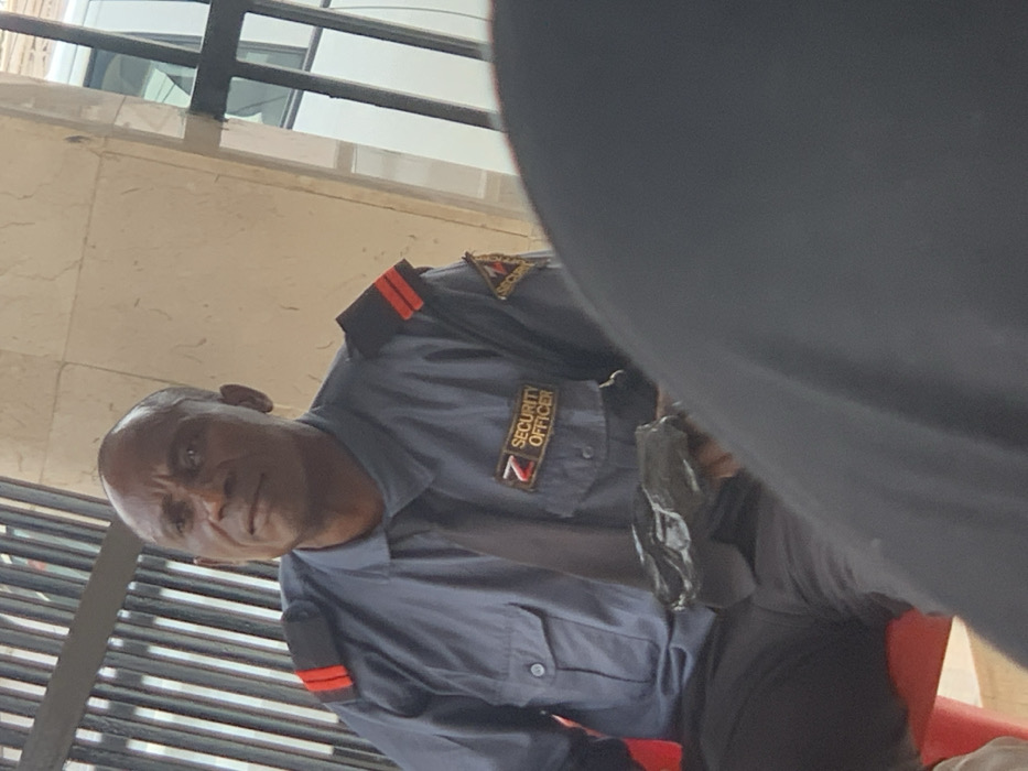 A close-up, slightly tilted shot focuses on a security officer. He's wearing a blue uniform with red stripes on the shoulder pads. A patch on his chest reads "SECURITY OFFICER" with a stylized "N" logo. His face is visible, with a stern expression. He is bald and appears to be middle-aged. Part of his body is cut off by an out-of-focus foreground figure on the right side. A building facade and railing are visible in the background. He is holding a dark object.