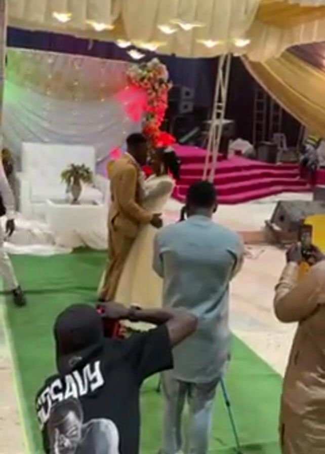 wedding photography session. A bride and groom are embracing each other on a green runner leading to a backdrop with white and gold fabric. The groom is wearing a tan suit and the bride is wearing a white dress. Several photographers are capturing the moment, positioned around the couple. One photographer is wearing a black T-shirt with a white print. The environment appears to be an indoor wedding venue, with chairs, lighting, and stage decorations visible in the background.