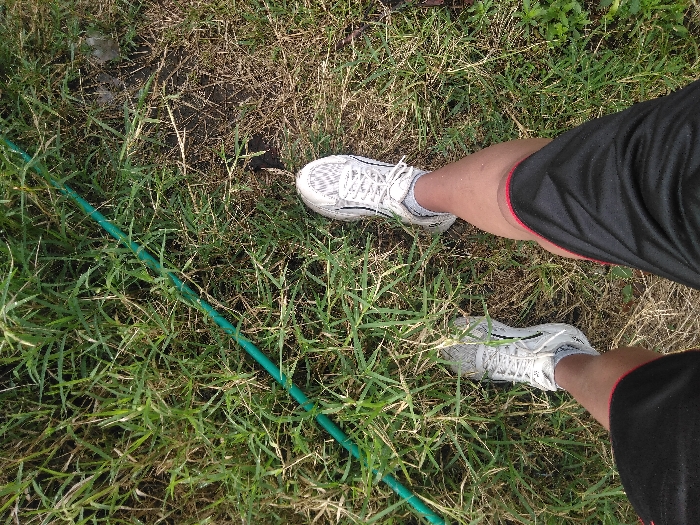 This overhead shot depicts the lower legs and feet of an individual standing on uneven ground. The person wears black athletic shorts with red trim, white socks, and white athletic shoes with grey accents, identifiable as Asics. The ground consists of a mix of green and dry brown grass, with visible patches of dark soil. A green hose traverses diagonally across the lower left section of the frame, partially concealed by vegetation. No specific landmarks or architectural features are present to determine the precise location within Røros, Norway.