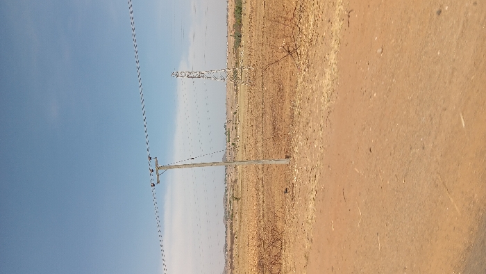 The scene captures an open, dry landscape within Kuru, Nigeria, under a clear, pale blue sky. The immediate foreground shows an unpaved reddish-brown dirt road. A light-colored utility pole, positioned left of center, extends vertically from the ground, supporting a series of horizontal power lines traversing the upper-mid section of the image. Further right and in the midground, a tall, metallic lattice-type transmission tower stands. The terrain beyond the road consists of vast, dry, brownish-yellow earth with sparse, low-lying thorny bushes and desiccated vegetation. In the distant background, a low-density settlement of clustered structures is visible against a backdrop of undulating hills on the horizon. No human or animal figures are present, and no specific activities are discernible.