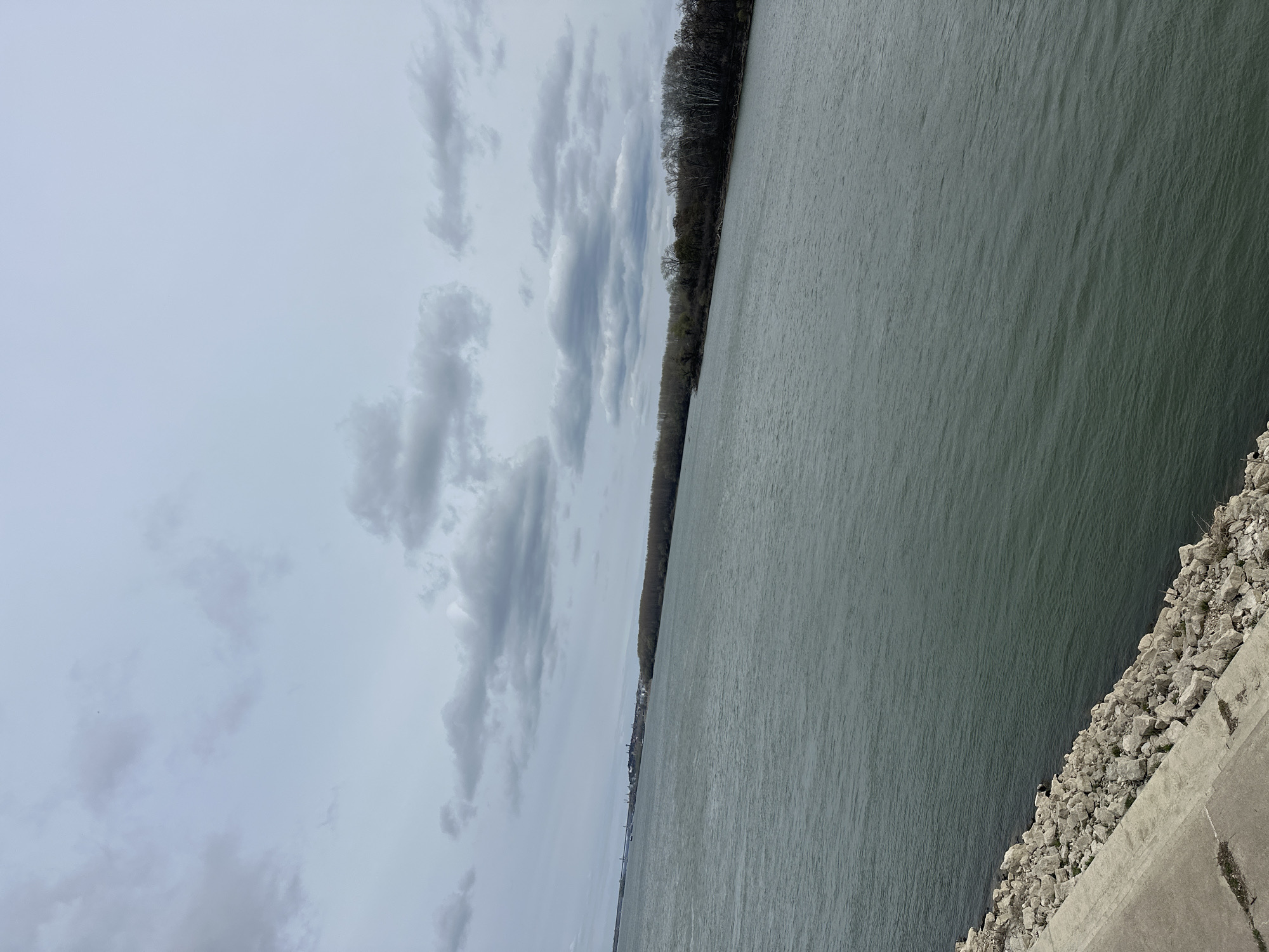 body of water, likely the Danube River based on the location being Vidin, Bulgaria. The water is gray and rippled, suggesting a windy or turbulent surface. The sky is overcast with gray clouds. A strip of trees lines the opposite bank of the river. In the lower right corner of the image, there is a concrete embankment covered with rocks and vegetation. The image is rotated clockwise from its original orientation.