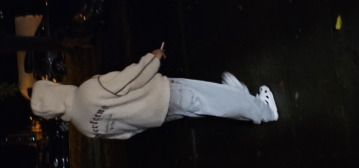 An individual is depicted walking at night on a dark paved surface in Dresden, Germany. The person is observed from the rear-right, moving left to right across the frame. They are wearing a light-colored (off-white or light gray) hooded sweatshirt with dark contrasting stitching, light blue baggy jeans, and white perforated sandals or clogs. A dark graphic, possibly reading "Werfteng," is visible on the back of the sweatshirt. The individual's right hand holds a white cigarette. The background is dark and out of focus, revealing streetlights or distant building lights on the left, several parked vehicles (including a dark SUV with a roof box), and the outline of a tree. Scattered leaves, some yellow, are visible on the ground.