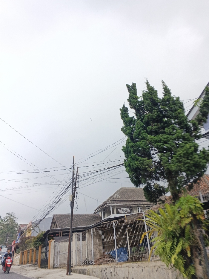 The image captures an outdoor street scene in Drangpa Pangsar, Bhutan, under a uniformly overcast, light-grey sky. In the foreground, a paved road curves to the left, where a single individual on a red scooter, facing away from the viewer, is in motion. A low, light-colored concrete or stone wall separates the road from adjacent properties. A dark utility pole stands centrally, heavily laden with numerous black electrical and communication wires extending across the midground. Behind the utility pole, multiple buildings with various roof styles, including dark gabled roofs, are visible. One structure features a fenced area with blue tarps visible inside. To the right, a tall, dark green coniferous tree dominates the right side of the frame, with a broad-leaf green plant in the immediate foreground. A small bird is discernible in flight in the upper-left sky quadrant.