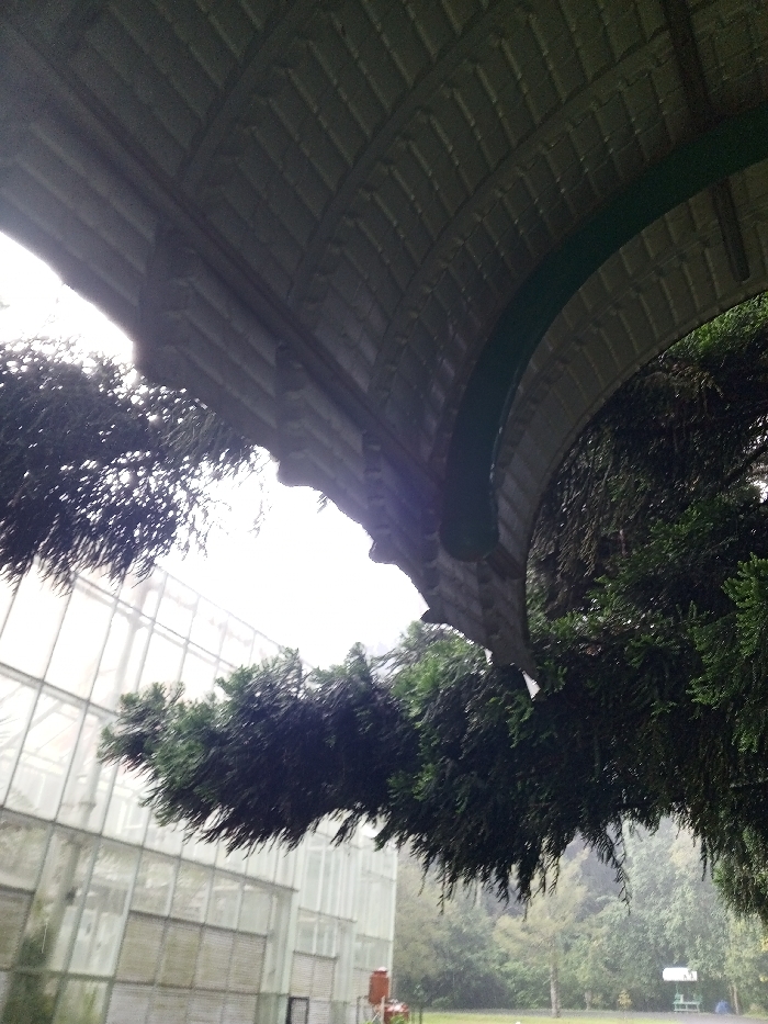 A low-angle shot features a curved, textured concrete structure, possibly part of a building or architectural detail. Dense, dark green foliage surrounds the structure on both sides. A greenhouse with glass panels is visible to the left, and a grassy field with trees extends into the background on the right. The sky is overcast, creating a soft, diffused light. A small sign and bench sit in the field.