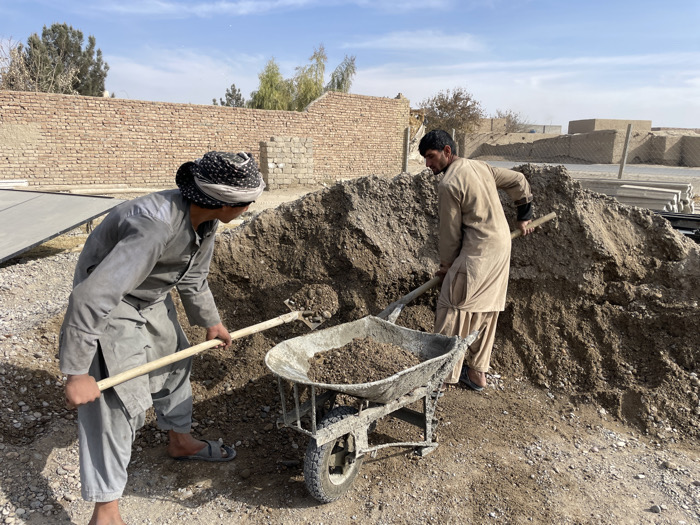 In Nakhonay, Afghanistan, two adult males are engaged in manual labor, actively shoveling earthen material into a wheelbarrow on an unpaved outdoor site