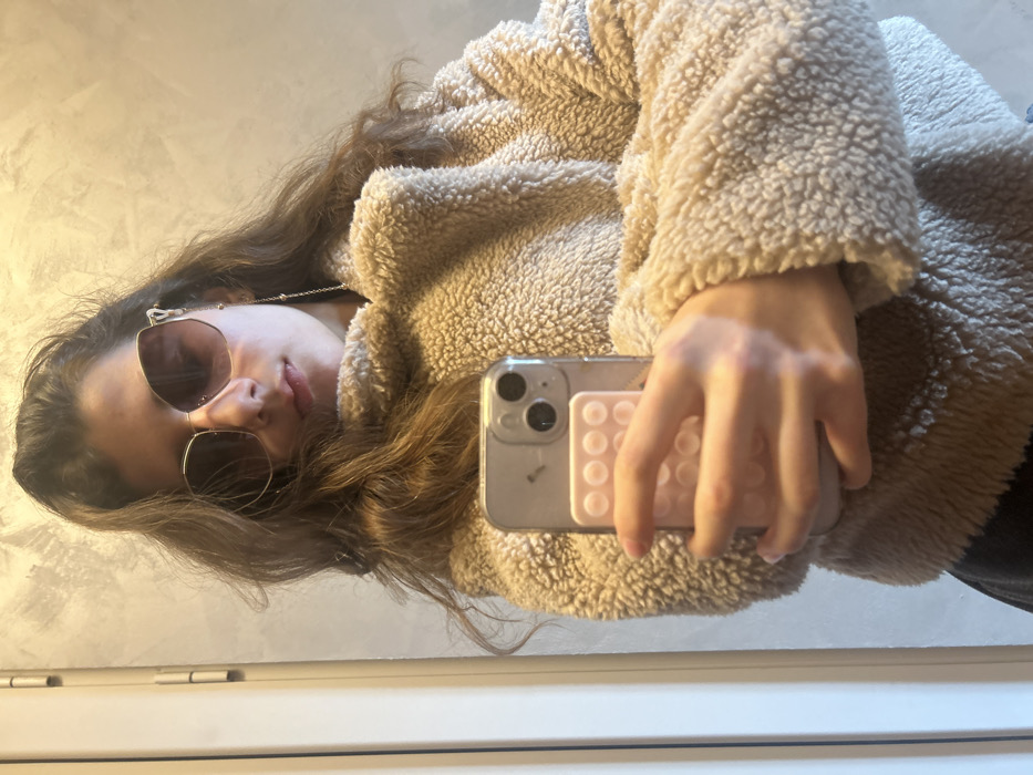 A lone female is depicted in a mirror selfie, taken indoors in the city of Ruse, Bulgaria. She has long, wavy brown hair and wears large, hexagonal-frame sunglasses with light-tinted lenses, from which a thin decorative chain dangles from the right temple. She is dressed in a light beige, textured teddy fleece jacket. Her right hand holds a silver-colored smartphone, fitted with a transparent case and a light pink rectangular grip attachment featuring multiple circular nubs on its back. The smartphone's multi-lens camera array is visible, reflecting towards the viewer. The background behind her reflection consists of a light grey, textured wall surface, with a distinct vertical white element, likely a door frame or mirror edge, positioned on the left side of the image.