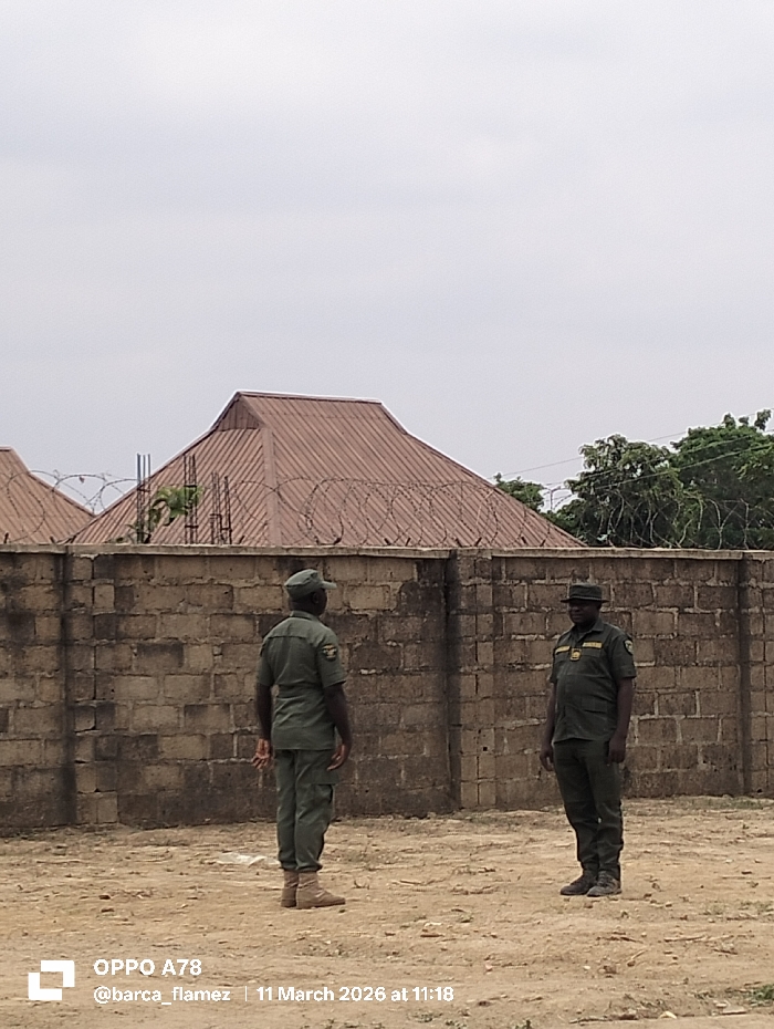 The image displays an outdoor scene in Gidan Kado, Nigeria, featuring two uniformed males standing on dry, light-brown earth. In the foreground, the ground is sandy and sparsely covered. In the midground, two adult males, both wearing matching short-sleeved green uniforms and caps, are present. The man on the left stands with his back to the viewer, wearing light brown boots. The man on the right faces the viewer, his head slightly turned towards the left man, wearing dark shoes and a dark cap, with an insignia visible on his left sleeve. Behind the individuals, a weathered concrete block wall, approximately two meters in height, stretches across the frame. Multiple coils of barbed or razor wire are affixed to the top of this wall, running its length. In the background, behind the security wall, a reddish-brown corrugated metal roof of a building is partially visible on the left. To the right, green tree foliage extends above the wall. The sky overhead is overcast and light grey. Both men are standing still, not engaged in active movement or direct interaction.