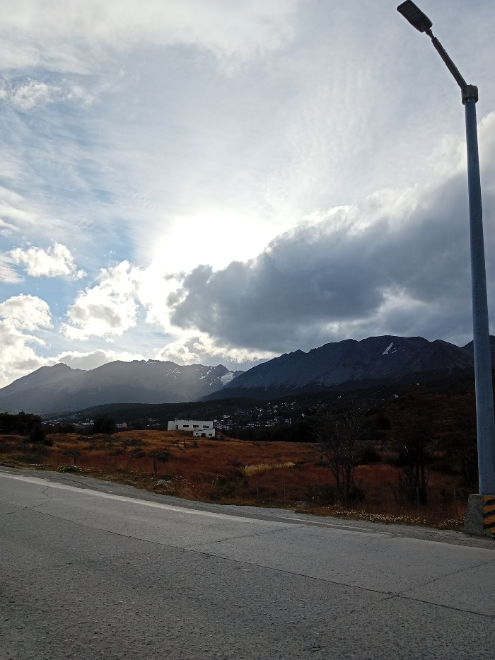 A scenic view features a road in the foreground leading to a landscape with mountains under a cloudy sky. The sun shines through the clouds, creating a bright spot in the sky. A modern street lamp stands tall on the right. In the midground, there is a building complex amid vegetation. The mountains serve as the backdrop, with patches of snow visible on their peaks.