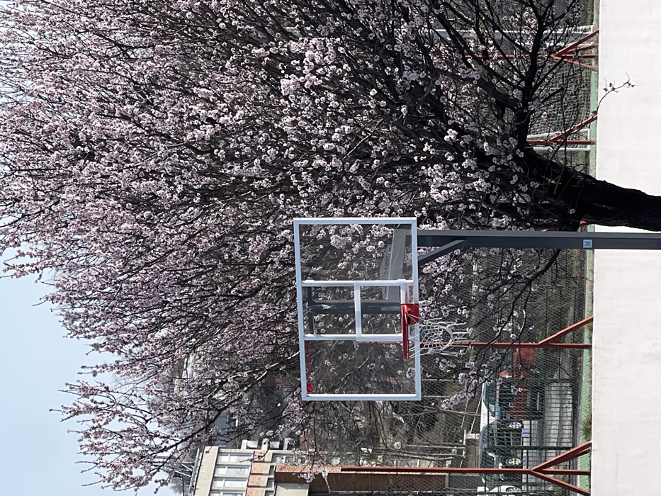 An outdoor basketball court in Varna, Bulgaria, is depicted under clear, light blue skies. A basketball hoop with a clear, white-framed backboard, a red rim, and a white net is centrally positioned. To its right, a large tree is in full bloom, densely covered in light pink flowers, its dark branches visible beneath the blossoms. The court perimeter is defined by a low, white wall, with a green surface visible immediately beyond. In the mid-ground, a dark wire mesh fence separates the court from an area containing parked vehicles, including a dark SUV and a red car. Red triangular support structures are also visible behind the fence. The background on the left reveals a multi-story building featuring reddish-brown brick elements and numerous windows, consistent with an urban environment. No individuals are present in the scene.