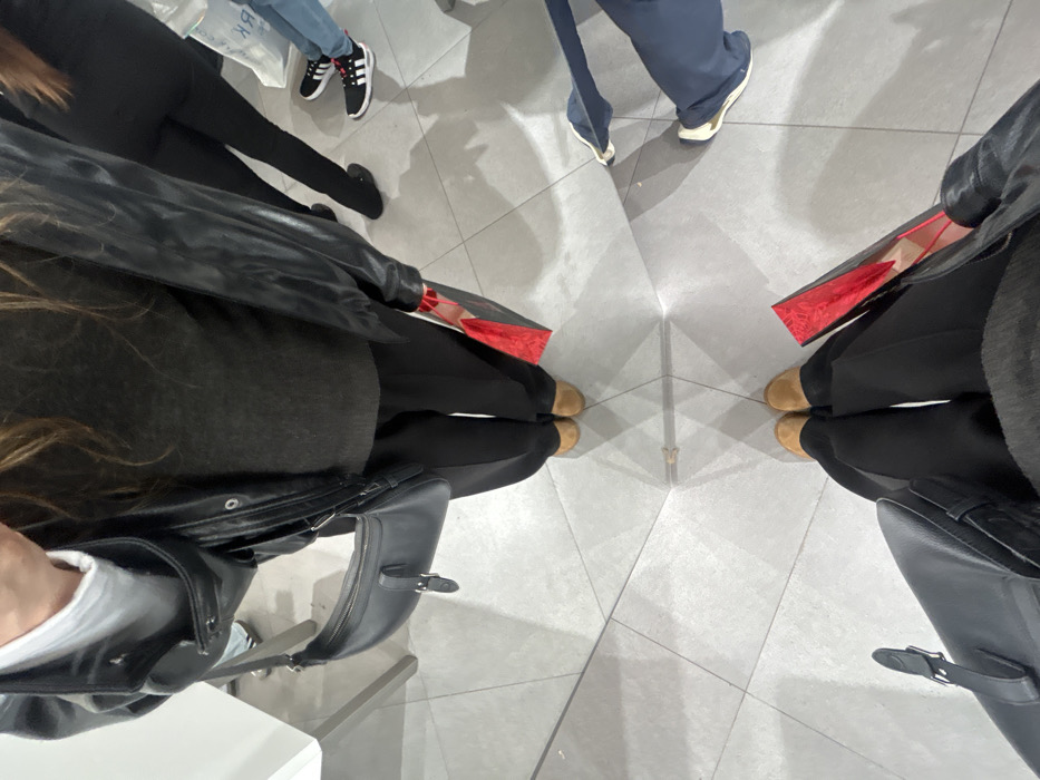 A top-down, slightly angled view shows a mirrored floor. On either side of the reflection point, a person stands holding a red shopping bag. One person is wearing black pants and tan shoes, a gray sweater and a black leather jacket, with a black bag hanging. A similar outfit is reflected. Other people's legs are seen in the background, one wearing Adidas sneakers. The floor is tiled in a diamond pattern.