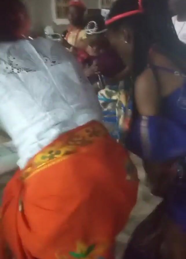The video depicts a group of women in what appears to be an indoor setting. One woman in the foreground is wearing a white, long-sleeved top with lace detailing and an orange, patterned wrap around her waist. She is dancing, moving her hips and torso. Other women are visible in the background, some of whom are singing and holding microphones. The background is somewhat blurry but shows what looks like a building exterior with windows. The lighting is dim and the overall scene suggests a celebratory or festive gathering.