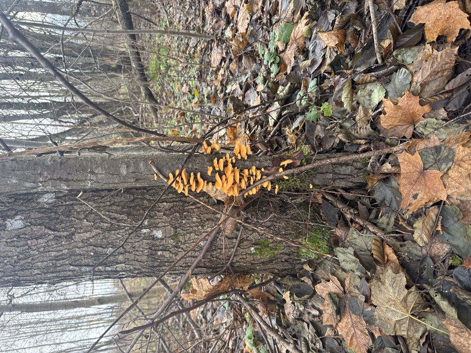 This image depicts a woodland scene in Petriškė, Lithuania. The foreground is dominated by two tree trunks: a thicker, grey-brown trunk with rough bark on the left, partially covered in green moss near its base, and a thinner, lighter-barked trunk on the right. A dense cluster of small, bright orange-yellow mushrooms grows vertically on the right side of the thinner trunk. The ground is thickly covered with fallen autumn leaves in various shades of brown, tan, and dark grey, along with scattered bare twigs and branches. In the midground and background, numerous bare tree trunks and branches form a dense forest environment under an overcast sky. A fallen tree trunk lies horizontally across the midground on the right side. No individuals, animals, or man-made objects are visible.