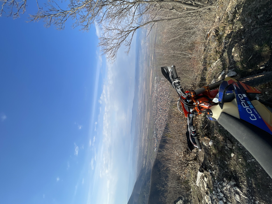 - "An orange and blue dirt bike is positioned on a rocky, uneven mountainside, overlooking the town of Kostenets, Bulgaria" by FM-UNIU53, licensed under CC BY 4.0