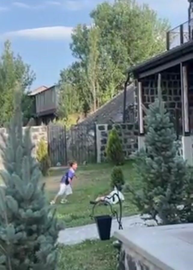 Two young boys are playing in a grassy yard on a sunny day. One boy in a blue shirt and white shorts is chasing the other boy, who is wearing a white shirt and lighter shorts, and who is holding a red ball. A black bucket sits near a short stone well. The yard is surrounded by trees and bushes, and a stone house with a second-story balcony is visible in the background. A stone wall and fence also border the yard. Music is playing in the background.