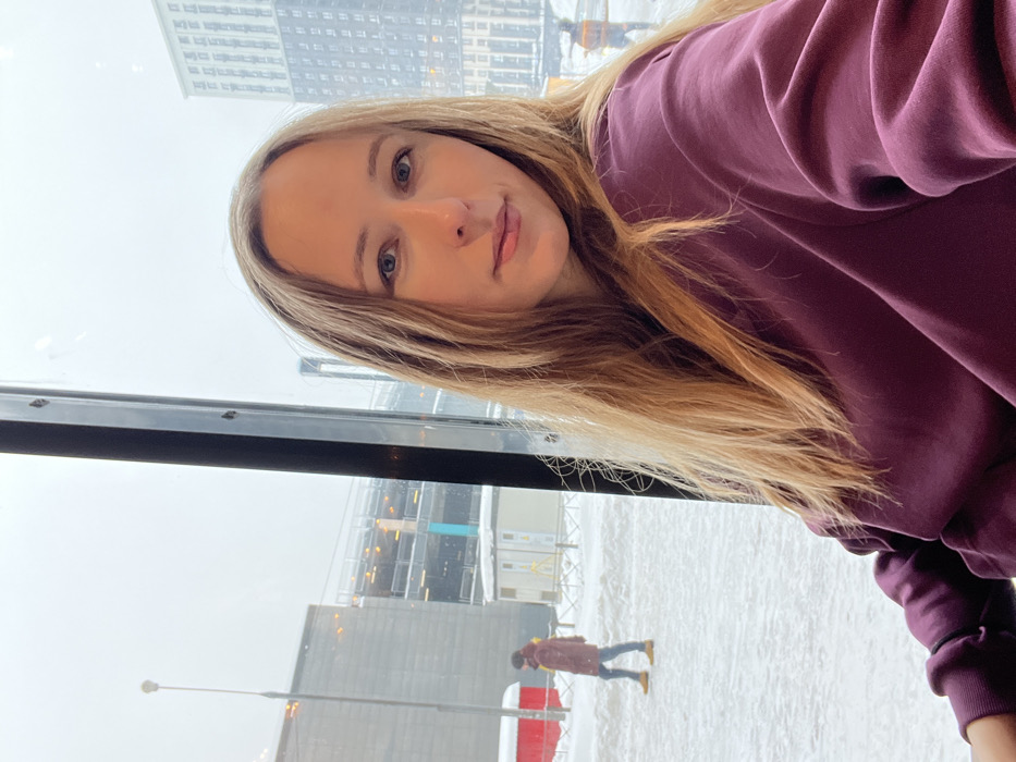 The image depicts a female individual indoors, seated near a large window, with an urban winter landscape of Mytishchi, Russia, visible outside