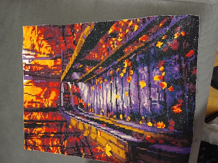 An approximately rectangular, completed diamond painting is observed resting on a dark grey, textured surface, angled slightly counter-clockwise