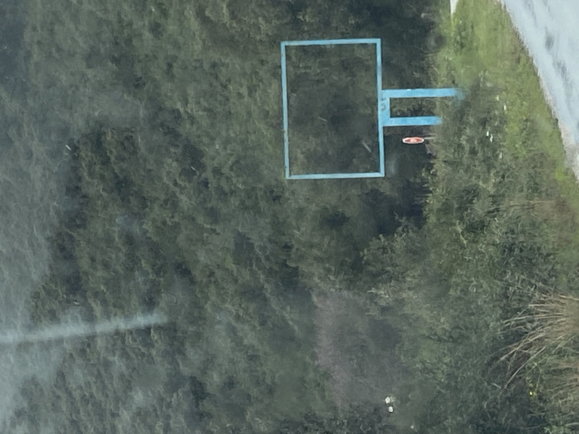 The image displays an outdoor scene in Dubraljevina, Montenegro, characterized by dense vegetation and a section of a paved road. The lower right foreground shows a wet, dark gray asphalt road surface. Adjacent to the road, the lower-midground is populated by overgrown green and brown foliage, including tall grasses and bushes. Centered in the midground on the right, an empty light blue billboard frame stands, comprising a rectangular upper structure supported by a robust central post. A small, round, red and white regulatory sign is partially obscured by foliage directly behind and to the left of the billboard's support post. The background and upper two-thirds of the image are dominated by a steeply rising hillside densely covered with dark green trees and bushes, indicative of a forested environment. Multiple faint, light-colored streaks and spots are visible across the image, consistent with reflections or lens artifacts. No individuals or discernible actions are present within the scene.
