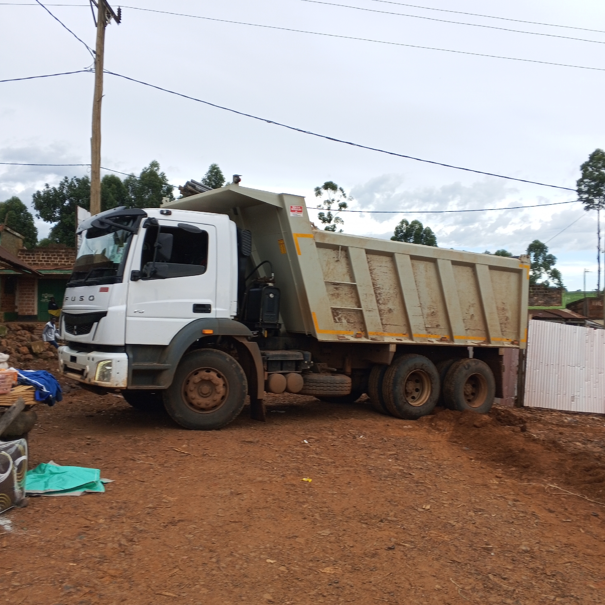 A white Fuso dump truck is parked on reddish-brown dirt ground in Borabu Chitago ward, Kenya, under an overcast sky. The truck, oriented towards the left, has a light-colored (beige/light gray) dump bed with yellow reflective tape and a "DANGER" sticker on its left side. The ground exhibits minor irregularities and scattered debris. To the left of the truck's front bumper, a woven brown basket containing thin wooden or bamboo sticks rests on the ground, with blue fabric draped beneath it. A partially obscured white patterned container is also present. A crumpled green plastic sheet lies on the dirt near the front left tire. Behind the truck's front section, a person is partially visible, wearing a light-colored top and dark pants, appearing to sit or lean near a building with exposed reddish bricks and a dark green lower wall. Another building with a reddish roof is partially visible further left. A wooden utility pole with power lines extends vertically from the left side of the frame towards the sky. On the right side of the frame, behind the dump truck, a white corrugated metal fence stands. Beyond the fence and truck, a green vegetated area extends towards a distant tree line and a stone/brick structure. Green trees are visible in the background across the horizon.