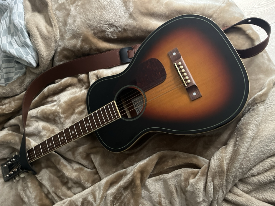 Acoustic guitar lies diagonally on a tan, plush blanket. The guitar has a brown and tan sunburst body with a black rim, a brown pickguard, and a brown leather strap. The guitar's headstock is at the lower left, while the body extends toward the upper right. The strap forms a loop at the top right. A white checkered object is on the left edge.
