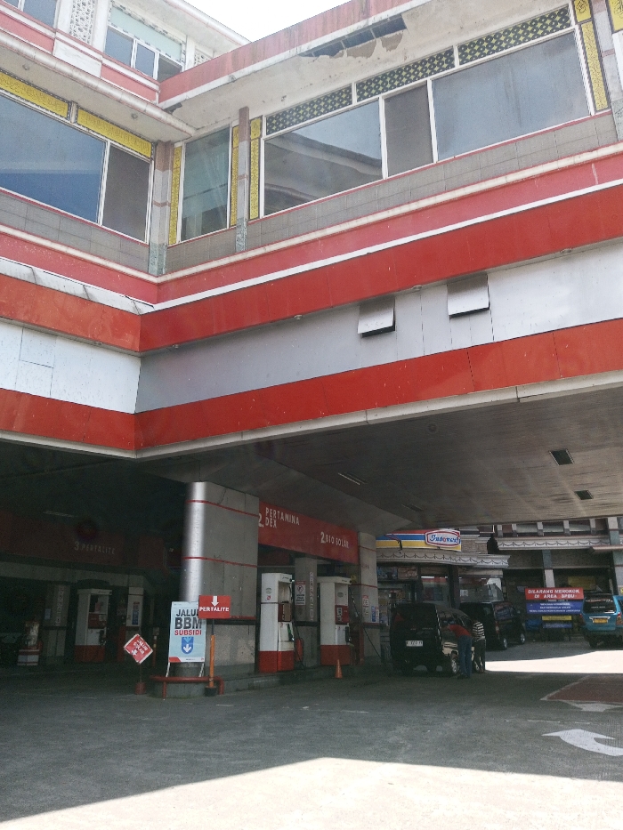 The image displays a multi-level commercial building, with a gas station occupying the ground floor in the city of Boommlog, Bhutan. The structure's lower section and gas station canopy are characterized by horizontal bands of red and silver/grey paneling. Above this, the building's upper levels feature numerous windows, some bordered by decorative yellow and dark geometric patterns, set against a light-colored facade with visible signs of weathering and minor concrete damage. On the ground level, under the protective canopy, several white and red fuel pumps are visible. Inscriptions on the pumps and supporting columns denote "PERTAMINA 2 DEX," "BIO SOLAR," and "3 PERTALITE." Multiple vehicles are present for refueling, including dark-colored cars and a light blue vehicle further in the background. Two individuals are observed near a dark car; one appears to be actively dispensing fuel, while the other stands nearby. A prominent blue and white sign, labeled "JALUR BBM SUBSIDI" with a right-pointing arrow, stands on the concrete forecourt alongside a red sign indicating "PERTALITE" with a downward arrow. In the background, an "Indomaret" sign is visible above other commercial establishments. A partially obscured blue sign in the distance displays text that includes "DILARANG MEROKOK DI AREA INI." The forecourt is paved with concrete. The scene is illuminated by daylight.