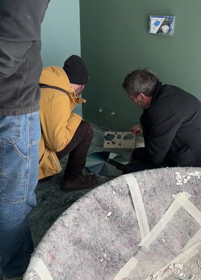 Three men are in a bathroom under construction. Two men squat down, looking at a fan deck of paint samples on the green marble floor. One of the men is wearing a yellow jacket and the other is wearing a black jacket. The third man is standing, wearing blue jeans and a grey sweatshirt. A covered bathtub sits in front of them, with white tape covering a protective layer. The wall is painted a seafoam green. A small white box is attached to the wall.