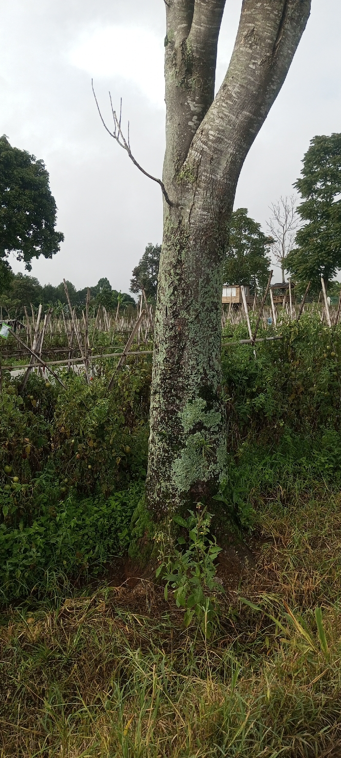 A tree trunk, partially covered in green lichen, stands prominently. Behind it, a garden or agricultural area is visible, supported by a structure of wooden stakes. Dense green vegetation and tomato plants thrive in this cultivated space. In the distance, other trees and a small structure can be seen under an overcast sky. The foreground is filled with tall grass.