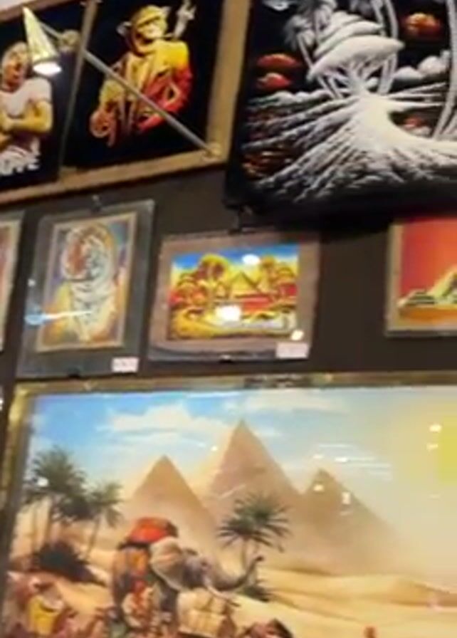 display of framed and unframed artwork for sale. The display includes artwork with images of athletes, animals, pyramids, and cities. The artwork includes both paintings and tapestries. A person holds up a phone to take a picture of the artwork. The environment appears to be a market or store.