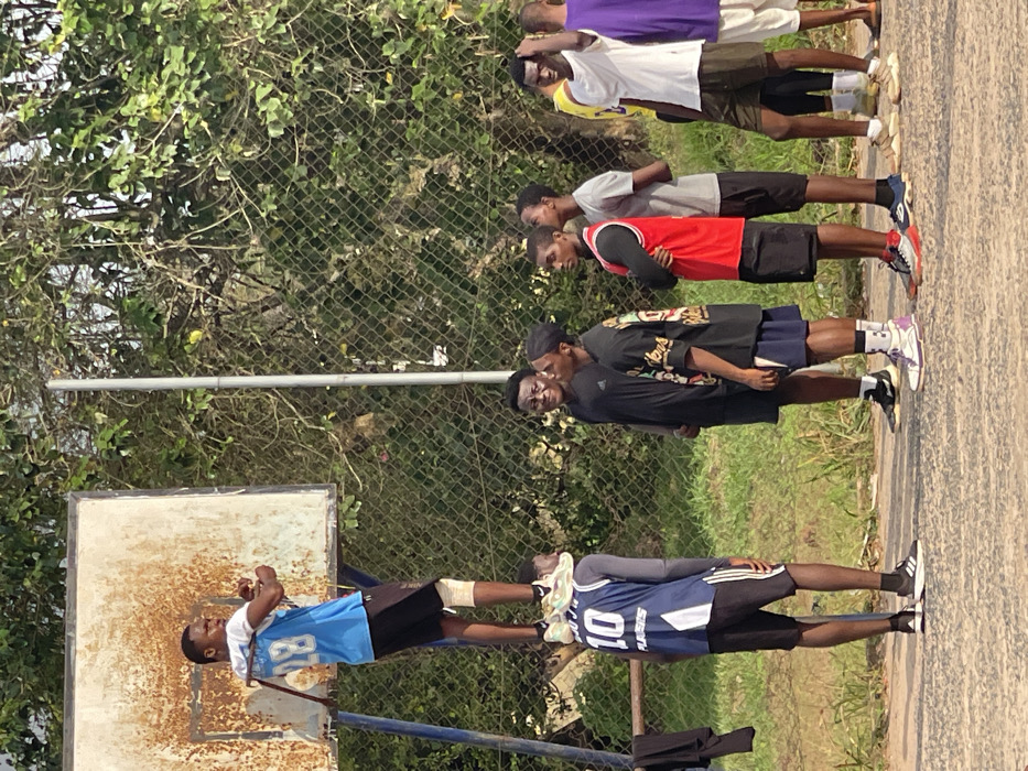 On an outdoor paved basketball court in Umunekwu, Nigeria, a young male, wearing a light blue sleeveless jersey with the number "28", black shorts, and a beige knee brace on his right leg, stands on the shoulders of another male, who wears a dark blue sleeveless jersey with the number "10" and black shorts