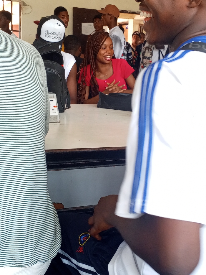 The scene depicts an indoor gathering in Ihiagwa, Nigeria, illuminated by natural light from a window positioned on the left. The environment features light-colored walls with visible wear, and papers are affixed to a background wall. In the immediate foreground, to the right, a dark-skinned individual’s right shoulder, arm, and a portion of their smiling face, revealing teeth, are visible; they wear a white shirt with two vertical blue stripes. To the left foreground, an individual's back, clad in a green and white horizontal striped long-sleeved shirt, is partially seen. Centrally in the midground, a young woman with long, dark braided hair sits at a light-colored table. She wears a red short-sleeved top, has pink-painted fingernails, and is smiling with her hands clasped on the table. A black pouch rests on the table in front of her, and to her left, a small white electronic device with orange accents is present. Several other young adults are visible standing in the background, including one wearing a black backpack and a black and white cap displaying "UC RICKY".