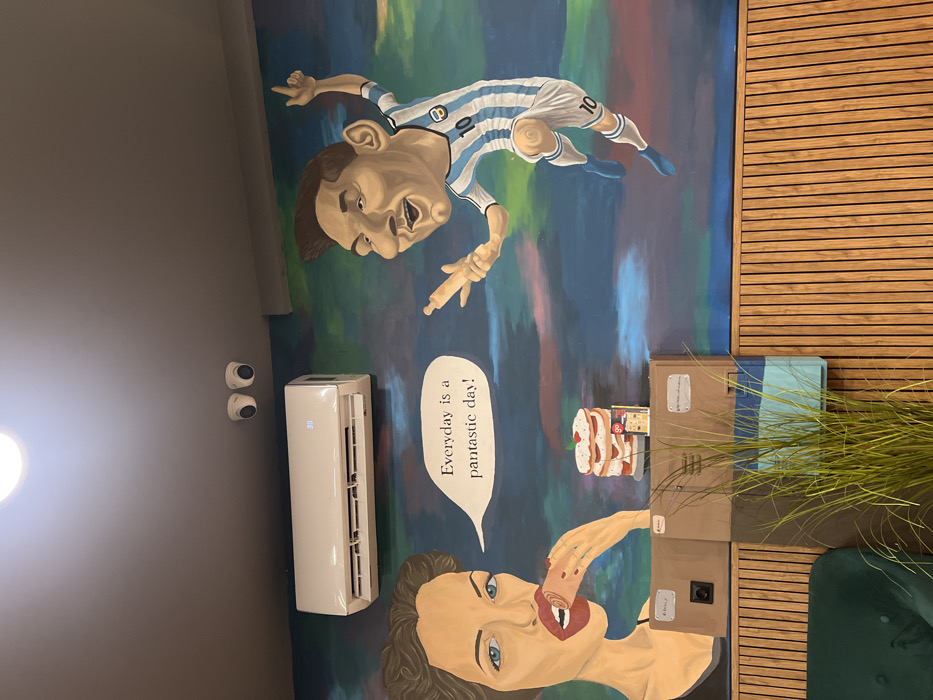 interior of a commercial establishment, specifically the restaurant PANTastic! located at ulitsa "Tsar Shishman" 28, 1000 Sofia Center, Sofia, Bulgaria. The upper portion of the frame features a light grey ceiling with a single circular recessed light fixture and two white dome-shaped security cameras mounted centrally. A white split-system air conditioning unit is installed high on the wall below the ceiling, displaying "30" on its digital screen. The primary visual element is a wall mural with a dynamic, abstract background composed of teal, dark blue, green, pink, and orange patches. On the left side of the mural, a caricatured depiction of a woman, resembling Angelina Jolie, is shown in profile, biting into a rolled-up pancake or crepe. A white speech bubble emanating from her mouth contains the text "Everyday is a pantastic day!". On the right side, a caricatured depiction of Lionel Messi is painted in an active, leaping pose, wearing an Argentina national football team jersey with the number 10, holding a wooden rolling pin in his left hand, and raising his right arm. Below the mural, a rectangular brown structure is mounted on the wall, featuring a black electrical outlet on its left side. On top of this structure, a small graphic of a multi-layered pancake or cake topped with a strawberry is displayed alongside a stack of small promotional flyers. The lower section of the wall is covered with vertical light-brown wooden slats. In the bottom-left foreground, a dark green upholstered seating element is partially visible, and a tall artificial plant with slender green leaves stands centrally in the foreground.