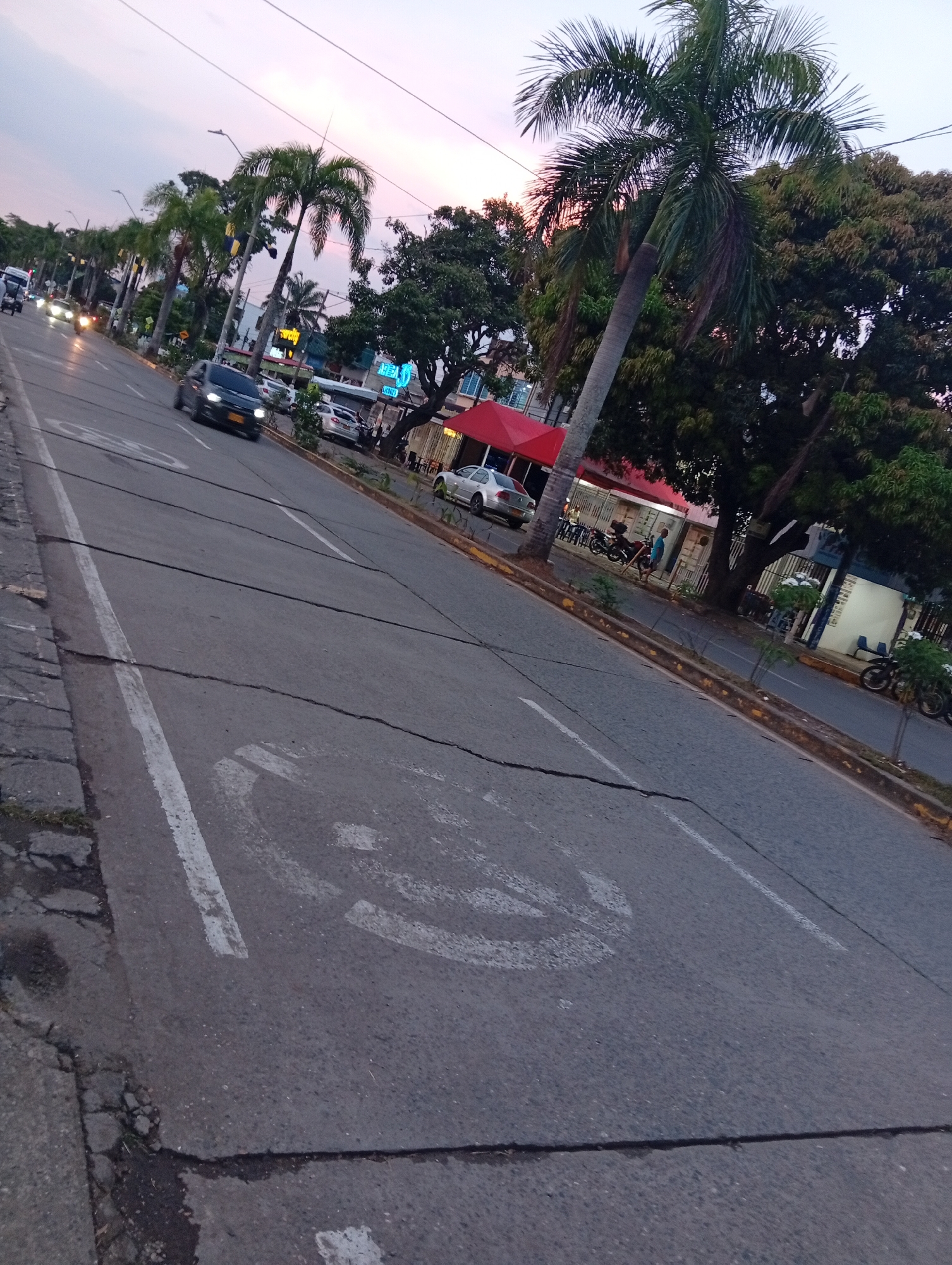 The image depicts a street scene in Jamundí, Colombia, at dusk. The sky overhead shows light pink and purple hues. The foreground features an asphalt road with visible transverse cracks. A solid white line delineates the left edge of the carriageway, and a white painted "No Parking" or "No Stopping" symbol (circle with a diagonal line) is visible on the road surface. A yellow-painted curb separates the road from a raised sidewalk or median on the right. Along the right side of the street, numerous tall palm trees and large deciduous trees are present. Beyond the trees and sidewalk, a row of commercial buildings lines the street. One building features a prominent red canopy/awning. Another, further down, is white with blue accents and an illuminated sign. Overhead, utility cables are visible against the sky. Traffic is present on the road. A dark-colored sedan with headlights illuminated is visible in the mid-ground, moving towards the viewer. Several other vehicles with headlights on are visible further down the street, indicating ongoing traffic. A silver sedan is parked on the right near the red canopy, and another light-colored vehicle is parked further down. Multiple motorcycles are parked on the sidewalk area adjacent to the commercial establishments. Several individuals are visible on the right side of the street near the parked motorcycles and buildings. One person wearing a blue shirt is standing near the motorcycles. Other figures are indistinct due to distance and low light. The overall scene suggests a busy urban or suburban thoroughfare during evening hours.